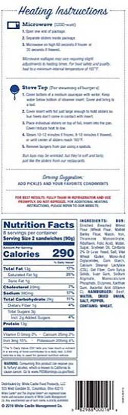 30 things you didn't know about White Castle - MSN The tiny White Castle "slider" cost just 5 cents in 1921, which amounts to about 66 cents today. ... The late Adam Yauch's vegan diet during his cancer treatment put some sobering distance between ... White Castle slider search - NBC4 WCMH-TV White Castle slider search 4 days ago ... Red, White, and BOOM! returns July 1, 2022 Local News / 19 hours ago. ... Streamline care for cancer patients What You Don't Know About White Castle's Famous Sliders So how much fat does White Castle have exactly? Each tiny slider packs 6 grams of fat — 2.5 of which is saturated. And with all that fat comes the calories, with 140 a slider. So if you pick up a Crave Case (30 sliders) you're looking at almost 4200 calories. They conducted a "study" to prove they were healthy Instagram White Castle Microwaveable Cheeseburgers - Shop Meals & Sides at H-E-B You want your sliders now! From Frozen: 1. Remove Sliders from plastic wrapper. 2. Place Sliders on a microwave-safe plate, with the bottom buns up, wrapped in a food grade paper towel with the open ends tucked under the top bun. 3. Microwave on a high setting (Based on 1200w microwave. Microwaves vary - adjust times accordingly to heat product.