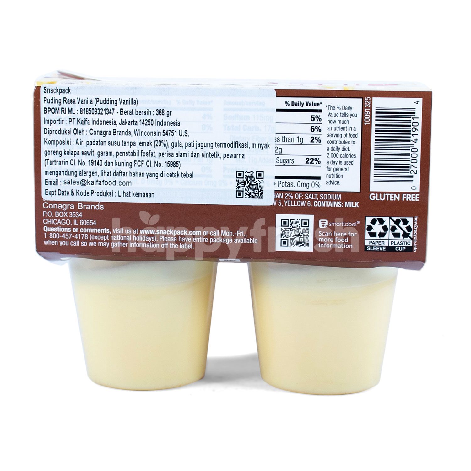 Hunts- Snack Pack Pudding, 3.25 oz, 36 Cups Variety Pack About this item Variety pack includes: Chocolate (18) & Vanilla (18) Made with real milk. Excellent source of calcium 3.25-ounce cups. 100 calories per serving Kosher dairy. Gluten free. Does not require refrigeration. No preservatives. No high fructose corn syrup. 0 g of trans fat per serving Try select livestreaming adventures for 50% off