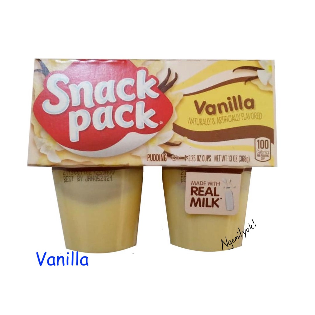 Snack Pack Vanilla Pudding - 13oz/4ct : Target Perfect for a sack lunch or on-the-go, these pudding cups are a creamy, delicious snack the whole family is sure to love Snack Pack Vanilla Pudding has 100 calories with no preservatives and zero grams trans fat per 3.25 oz serving.