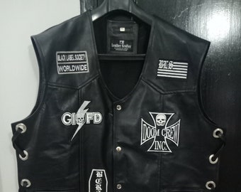 Black Label Society Vest | Authentic Biker Leather Vest - Jackets Hippo The Black Label Society leather vest is an iconic badass biker style leather vest for men that features a number of patches both on the front and back. The interior of this music band leather vest is augmented with sleek viscose lining while the men's black motorcycle leather vest has an open round neck style collar with a buttoned closure.