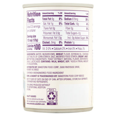 Cream of mushroom soup label. Campbell's® Classic Condensed Cream of Mushroom Soup Nutrition Facts ; 1.5g · 0mg ; 0%. Campbell's Condensed Cream of Mushroom WATER, MUSHROOMS, VEGETABLE OIL (CORN, CANOLA AND/OR SOYBEAN), CREAM, MODIFIED CORNSTARCH, WHEAT FLOUR, SALT, MODIFIED MILK INGREDIENTS, SOY PROTEIN ISOLATE, ... Calories in Campbells Cream Of Mushroom Soup - Nutritionix Campbells Cream Of Mushroom Soup ; Calories 241 ; Total Fat 16g grams ; Saturated Fat 2.8g grams ; Trans Fat 0.1g grams ; Polyunsaturated Fat 9.4g grams. Campbell's Condensed Cream of Mushroom Soup - H-E-B Nutrition Facts · Amount Per Serving. Calories. 100 · % Daily Value · Total Fat. 7g; 9% · Saturated Fat. 1g; 5% · Trans Fat. 0g · Polyunsaturated Fat. 3.5g.